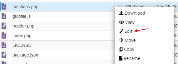 - Locate the functions.php file and edit it using a plain text editor like Notepad or TextEdit.