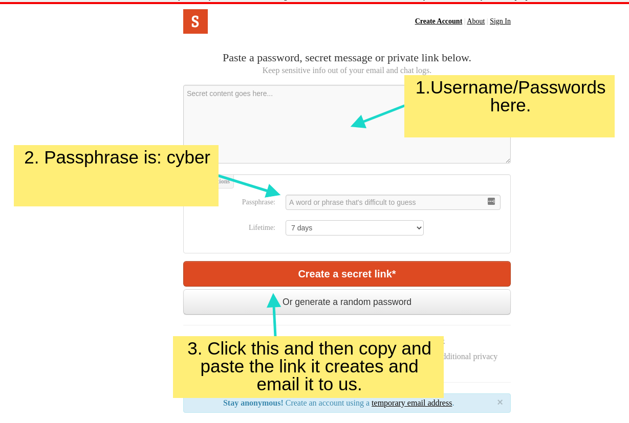 To share this securely, use “one-time secret” tool at the following website: https://onetimesecret.com/